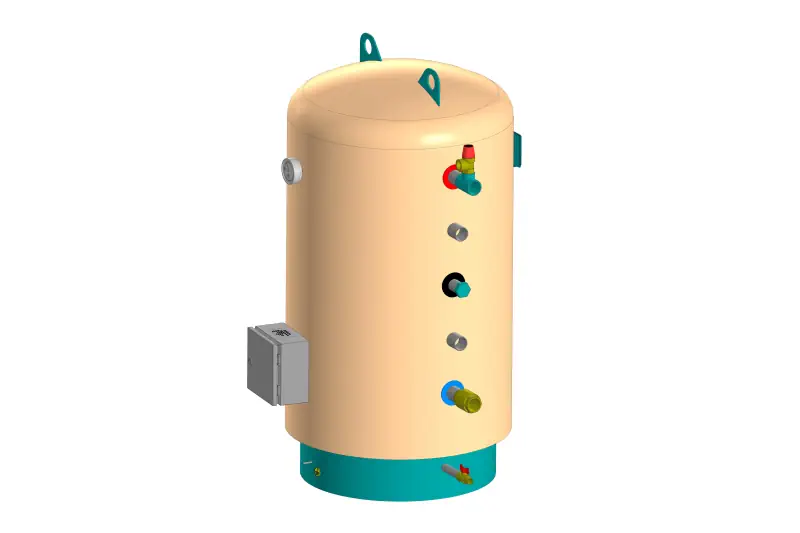 - Комплектация: Группа безопасности (обратный и предохранительный клапан), термоманометр, патрубок рециркуляции, поплавковый датчик, рабочий и аварийный температурные датчики.