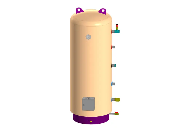 - Комплектация: группа безопасности (обратный и предохранительный клапан), термоманометр, патрубок рециркуляции, поплавковый датчик, рабочий и аварийный температурные датчики.